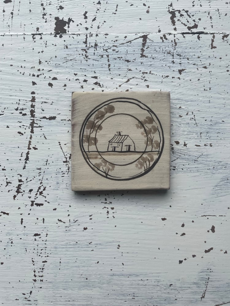 high fired unglazed terracotta tile, illustrated with white slip and oxide drawing.