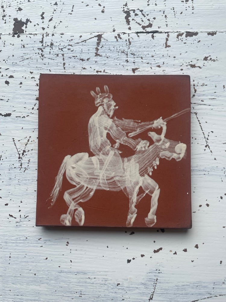 high fired unglazed terracotta tile, illustrated with white slip and brushed oxide.