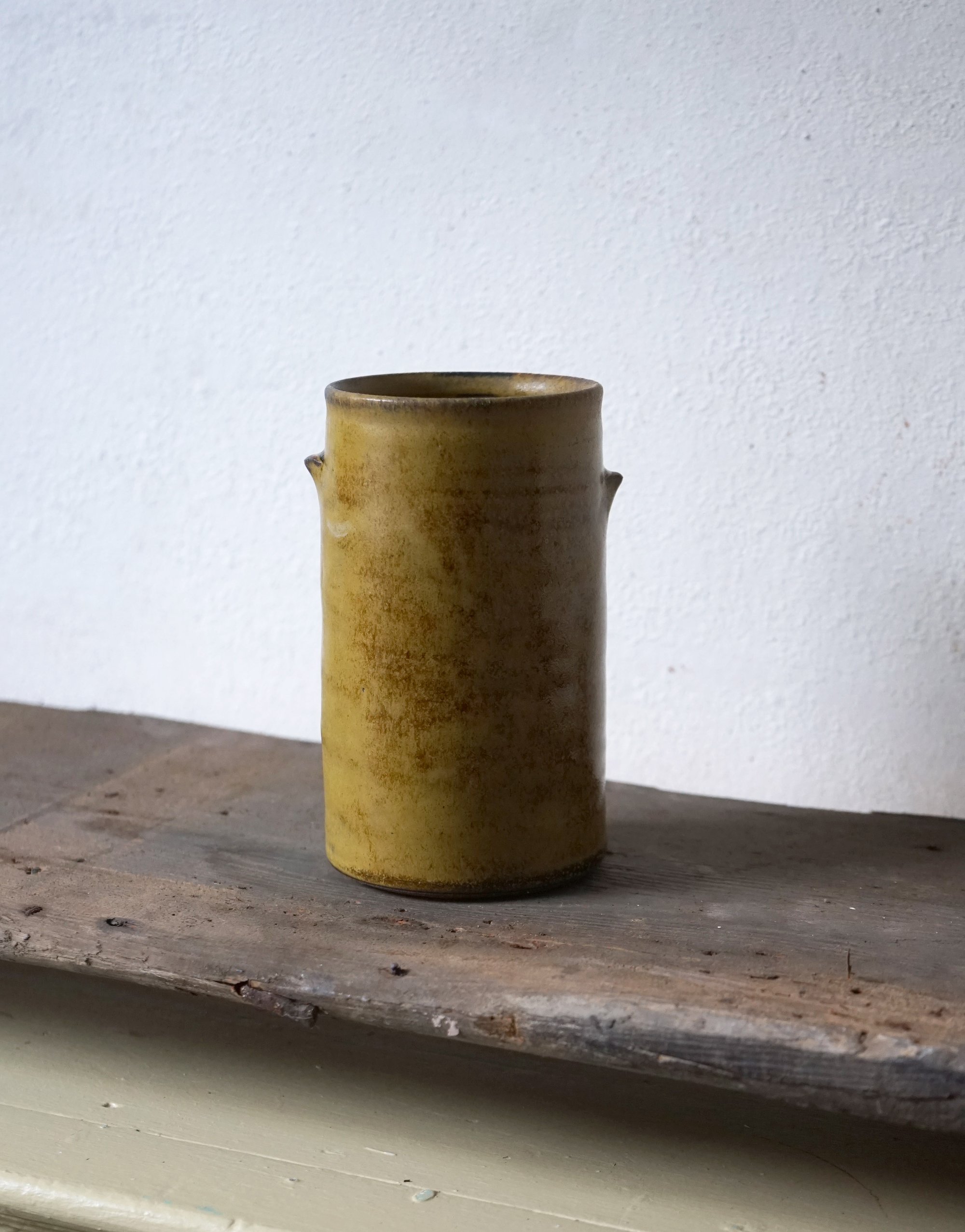 Large cylindrical vase, glazed all over in a golden semi matte glaze, which breaks to a gloss in parts. approximately 9x16