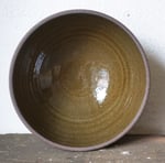 An all purpose eating bowl, breakfast lunch or dinner, wheel thrown in a black stoneware clay, glazed inside in a dark green shiny glaze, outside left raw.