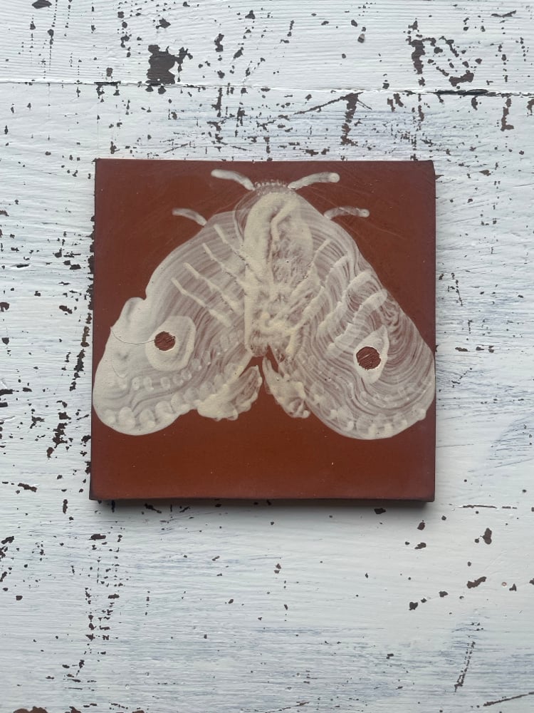 high fired unglazed terracotta tile, illustrated with white slip and sgraffito drawing.