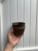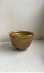 A footed bowl, for eating or dosplay, perfect for rice, ice cream or a soup. Glazed in a dark varigated glaze, matte yellow breaking to a glossy amber.